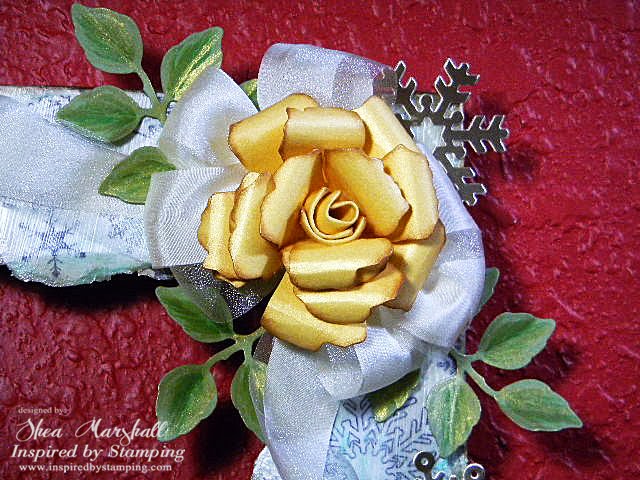 Another lovely rose. To this corner I also added a two-layer, triple-loop bow and let the streamers curl and twist along the length of each side of the frame. The leaves are die cuts from World Win Original Colormates Dark Spring Green that I've painted with Copics and then dry brushed with a bit of gold shimmer paint.